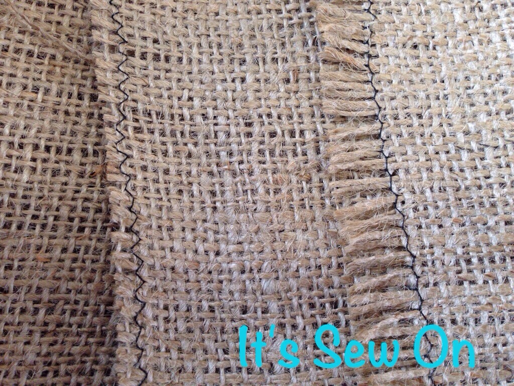 Next I cut the burlap for my ruffles. When I cut my panels I cut 2 extras that I planned to use for my ruffles. I did my strips 4″ wide, sewed 2 together (I only did my ruffles twice the length of my panels so they weren’t to ruffle-y, as if there’s such a thing!), and did a zig zag stitch down each edge to keep them from coming apart. (If I had thought it through more I would have just cut 1 panel twice the length of my panels so I didn’t have to sew 2 together. Things are always so much simpler in hindsight, right..lol)