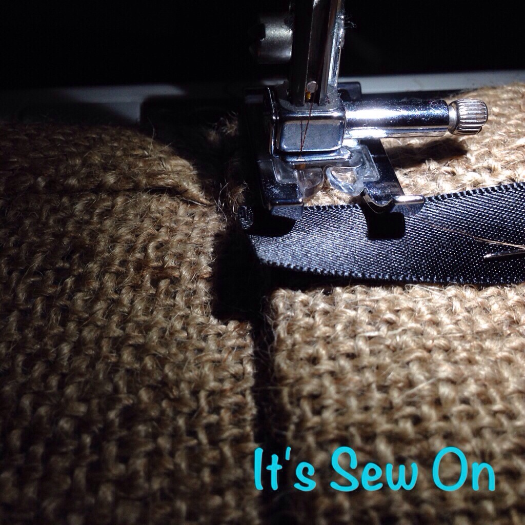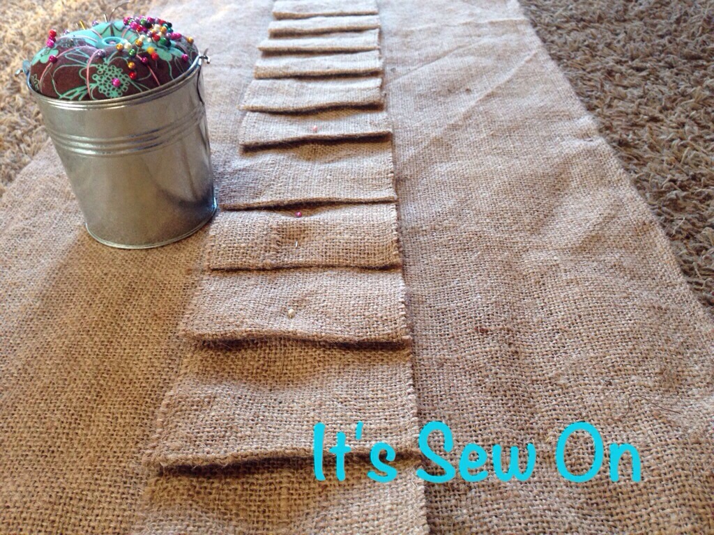 decided to do ribbon tabs, this was so easy and I love how they look hanging. I folded over an inch on the top ironed it (burlap keeps folds wonderfully so I don’t even bother to pin it) folded it over again 5″ and ironed it. Next I cut a bunch of 5″ strips of ribbon (I just 3/8″ satin, so that’s what I used. On my next set I make I think I’ll try wider ribbon) I heat sealed the ends of the ribbon and placed them about 5″ apart. These I did pin in place.